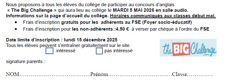 Cette année encore, l'équipe d'anglais propose à tous les élèves du collège Belledonne de participer au jeu concours du Big Challenge