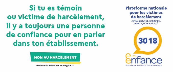 Des élèves se sont mobilisés pour dire NON au harcèlement et au cyberharcèlement en réalisant une affiche et une vidéo. MERCI pour leur engagement et BRAVO pour leur créativité.